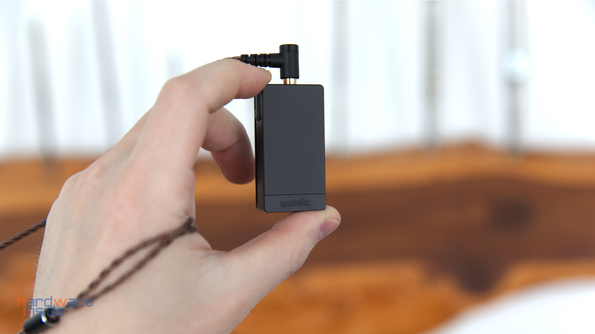 Der Ersteindruck der entsteht, hält man den Qudelix-5K das erste Mal in den Händen? Wie winzig der DAC/Verstärker doch ist! Mit seinen Abmessungen von nur 53 x 26 x 15 mm ist eine 9V Batterie ein passendes Vergleichsobjekt. Die Verarbeitung ist sehr gut, an der Stelle gibt es nichts zu kritisieren. Auch die 26 g entsprechen der Größe, diese sind in der Tasche oder an der Klamotte befestigt kaum bis nicht wahrnehmbar.