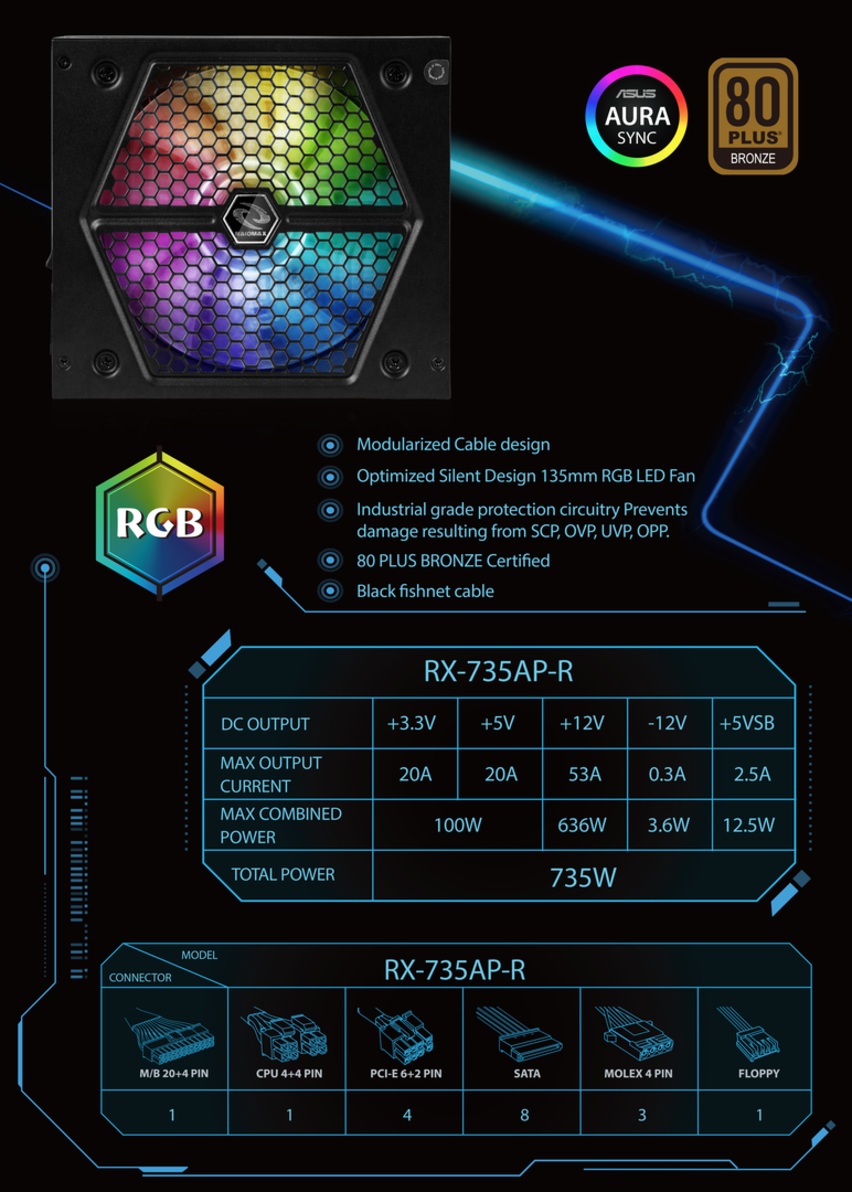 Bunt wie ein Weihnachtsbaum erstrahlt die neue Netzteilserie von Raidmax und bietet dazu noch eine Teilmodularität der Kabel und 80+ Bronze. Raidmax veröffentlichte heute die Thunder RGB Serie als mid-range Netzteil welche vor allem für Gamer gedacht. Zum Start der Serie gibt es zwei Modelle, das 735 Watt und das 535 Watt Thunder RGB Netzteil. Beide besitzen einen RGB-Lüfter mit 135 mm der durch einen 4-Pin-Anschluss versorgt wird. Dieser ist auch mit Asus Sync kompatibel.