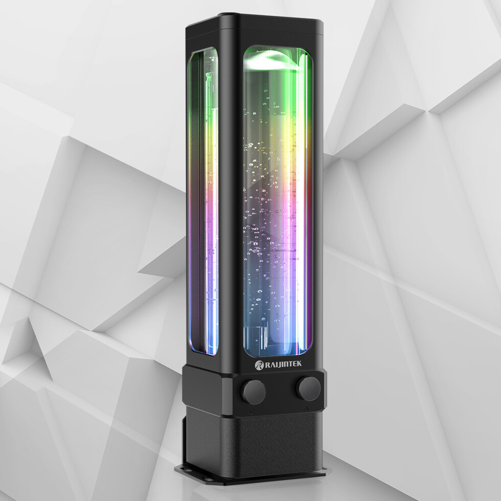 Raijintek stellte heute die Antil D5 EVO RBW vor, eine Vorrichtung, die einen Behälter mit einer Pumpe in einem einzigen Gerät kombiniert. Sie verfügt über einen Aluminiumrahmen, POM-Acetal-Enden für den Behälter und einen zylindrischen Behälter aus gehärtetem Glas mit einer Dicke von 6 mm. An beiden Enden des Reservoirs sind Armaturen angebracht. Adressierbare RGB-LED-Streifen säumen die Innenseiten des Aluminiumrahmens. Das untere Ende beherbergt die Pumpeneinheit.