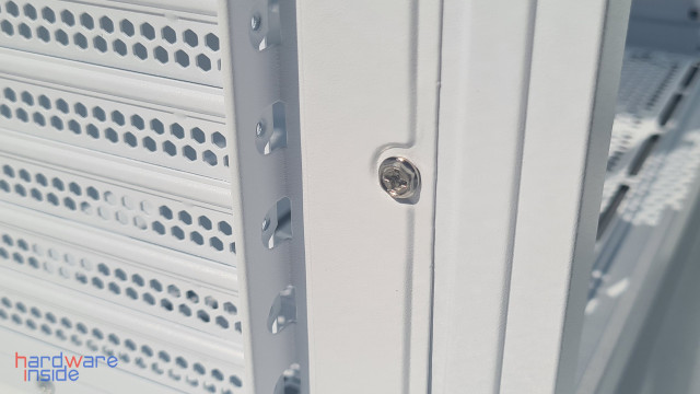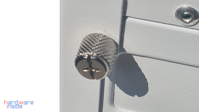 Selbiges gilt bei dem SPCC-Seitenteil mit 0,7 mm Stärke, zwei Rändelschrauben entfernen, fertig. Die zwei viereckig gelochten Bereiche dienen zur Wärmeabfuhr oder Luftzufuhr. Bei dem ersten wird die Abwärme von den etwaigen verbauten Lüftern oder einem Radiator nach außen befördert oder als Luftzufuhr für das Innere des Gehäuses verwendet. Die zweite dient zur Abfuhr der Abwärme des Netzteiles.