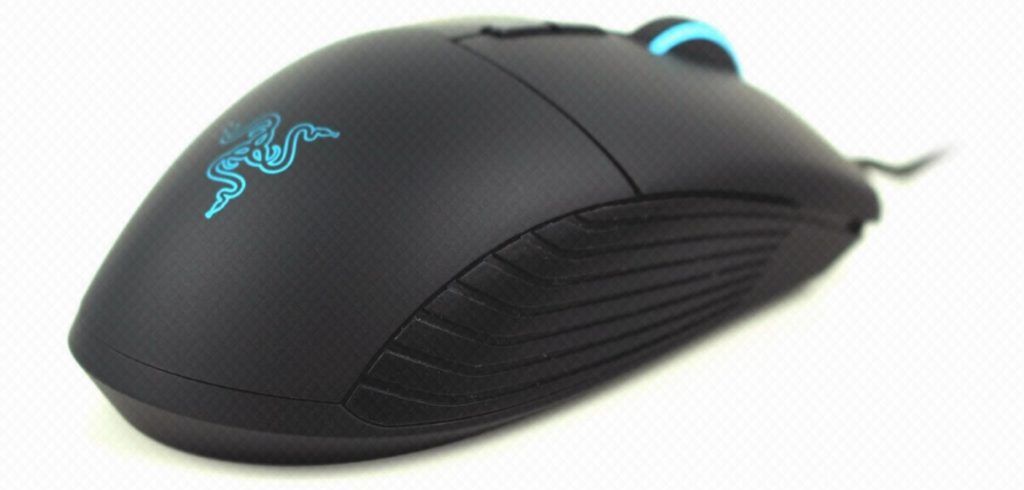 Von der Maus geht ein 180 cm langes und mit Gewebe ummanteltes Kabel ab, welches in einem vergoldeten USB Stecker endet. Im hinteren Bereich (der später vom Handballen verdeckt wird) ist das Razer Logo eingebracht, welches sich in verschiedenen Farben ausleuchten lässt. Im vorderen Bereich sind die beiden Haupttasten. Zwischen den Tasten liegt das Mausrad sowie zwei weitere, kleine Tasten. Das Mausrad verfügt über eine angenehme Rasterung und lässt sich einfach und präzise betätigen.
