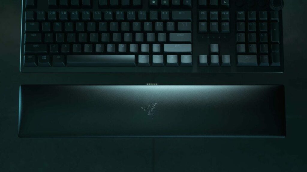 Die Huntsman V2 Analog macht aus dem PC-System die ultimative RGB Chroma-Battlestation. Wie der Vorgänger hat die Tastatur Underglow-Beleuchtung an jeder Seite – dazu zählt auch die nun rahmenlose, gepolsterte und magnetische Handballenablage aus Kunstleder.