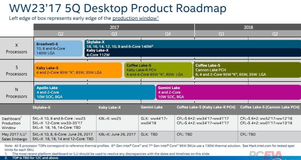 Auf der Roadmap sehen wir, dass der vollwertige Coffee Lake Chipsatz mit dem Namen Cannon Lake erst zum Ende des Jahres geplant ist und wir auf diesem Weg auch noch den zwei Kern CPU Support der Coffee Lake Reihe erwarten dürfen. Für die aktuellen Skylake X und Kaby Lake X gibt es anscheinend keine Neuerungen bis Mitte 2018.