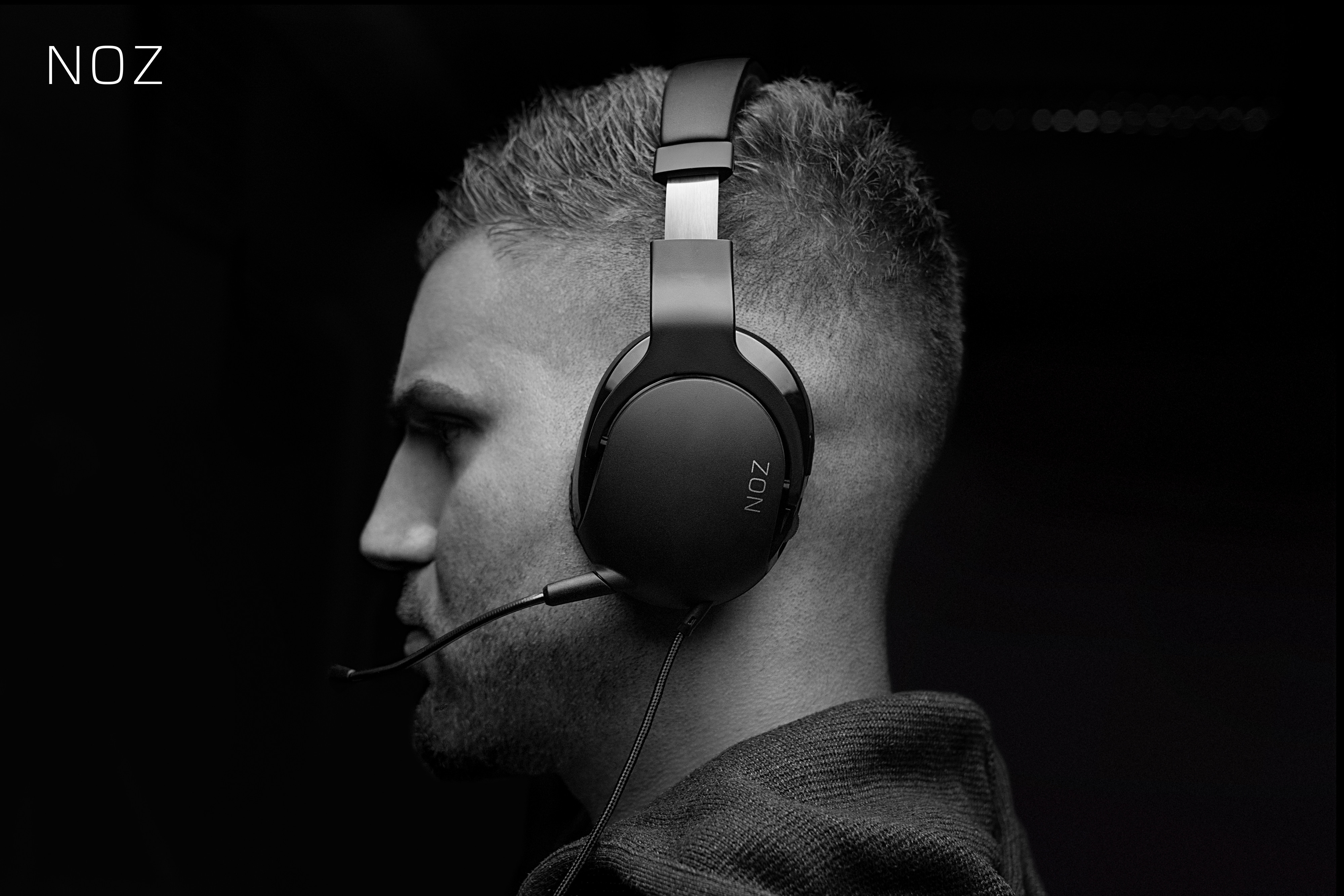 Der Wechsel zwischen matten und glänzenden Oberflächen in Kombination mit einem mit Kunstleder bezogenen Kopfband und dezent aufgedruckten Logos kennzeichnen das Design des Noz.