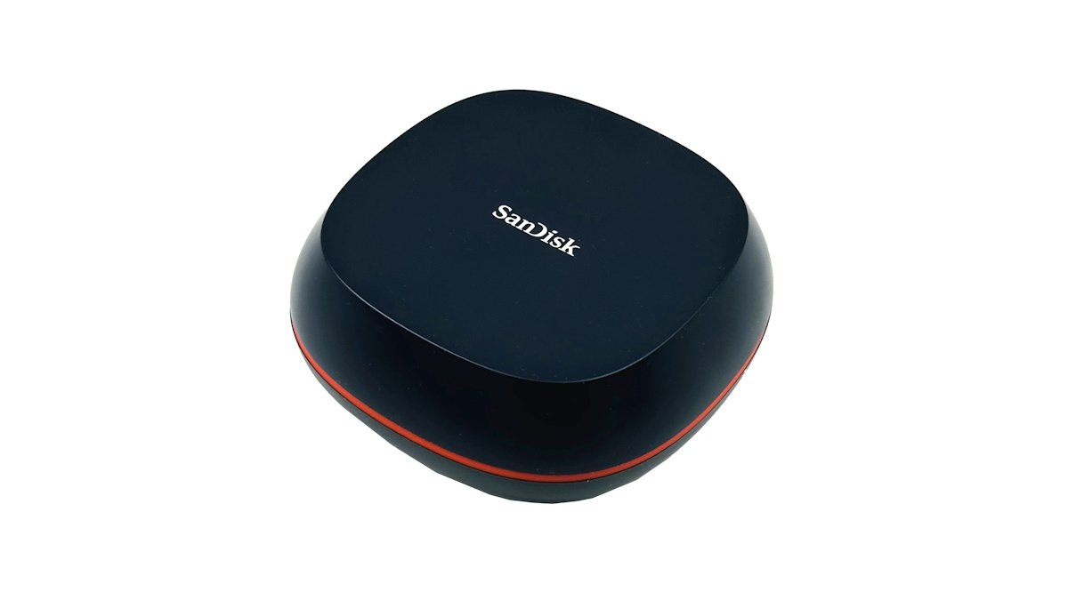 Das Gehäuse des SanDisk Desk Drive besteht aus schwarzem Kunststoff. In der Mitte trennt ein schmaler roter Streifen die Oberseite von der Unterseite ab. Die Oberseite trägt das Logo des Herstellers. Das Gehäuse ist gut verarbeitet und wiegt mit 268 Gramm erstaunlich viel. Wir mutmaßen, dass sich im Inneren eine Stahlplatte befinden könnte. Durch das Gewicht könnte das Gerät tendenziell etwas sicherer auf dem Schreibtisch stehen. Auf der Rückseite finden wir den USB-C und den Stromanschluss vor.