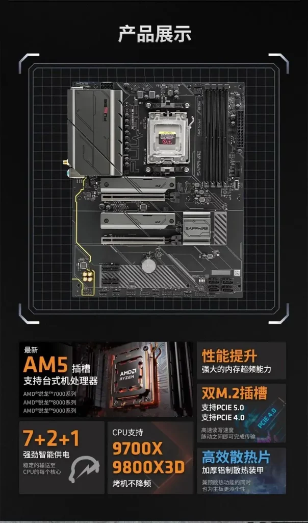 Sapphire hat kürzlich das PULSE B650A WIFI Mainboard vorgestellt – ein ATX-Mainboard im Standardformat, das sich an Desktop-Nutzer richtet, die zuverlässige Konnektivität und vielfältige Erweiterungsmöglichkeiten suchen. Die Platine im dunklen Design ist mit Kühlkörpern ausgestattet, die strategisch über dem linken VRM-Bereich, dem Chipsatz sowie zwei M.2-Steckplätzen positioniert sind, um eine effiziente Wärmeableitung zu gewährleisten. Die Spannungsversorgung erfolgt über ein 7+2+1-Phasendesign, wodurch selbst leistungsstarke 8-Kern-Zen-5-Prozessoren stabil betrieben werden können – ohne Taktreduzierung. Die Stromversorgung wird über einen einzelnen EPS-CPU-Stromanschluss sichergestellt.