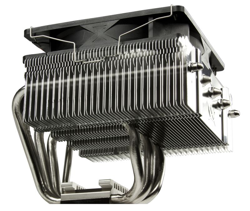Das angesprochene Hybrid-System sorgt zudem für eine hervorragende Performance des Kabuto 3. Möglich wird diese Leistung durch drei 8 mm dicke Kupferheatpipes, die im Zentrum montiert sind und zwei weiteren 6 mm dicken Heatpipes, die an den Außenseiten Platz finden. Alle fünf Heatpipes sind äußerst sauber mit der hochpräzise gefertigten Kupferbodenplatte verbunden. Das Ergebnis sind sehr gute Wärmeübergänge und letztlich eine gesteigerte Gesamtperformance. Sämtliche Kupferheatpipes sowie die Bodenplatte sind vor Korrosion durch eine Nickelbeschichtung geschützt.