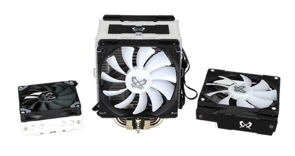 Die Verarbeitung des Mugen 5 ist rundum sehr gut. Die zwei mitgelieferten 120 mm Lüfter lassen sich mithilfe der Spangen relativ einfach am Kühlkörper montieren. Zur Vibrationsverringerung sind die Ecken gummiert. Jeder Lüfter besitzt zwei Kabel: ein 4-Pin Lüfterkabel und ein 3-Pin ARGB -Kabel. Des Weiteren geht ein 3-Pin ARGB -Kabel von der Deckplatte des Kühlers ab. Die CPU-Kontaktfläche besitzt relativ zum Kühlkörper einen Offset, um eine RAM-kompatible Montage zu gewährleisten. Insgesamt bietet der Scythe Mugen 5 sechs Heatpipes zur Wärmeweiterleitung an die Kühlfinnen.