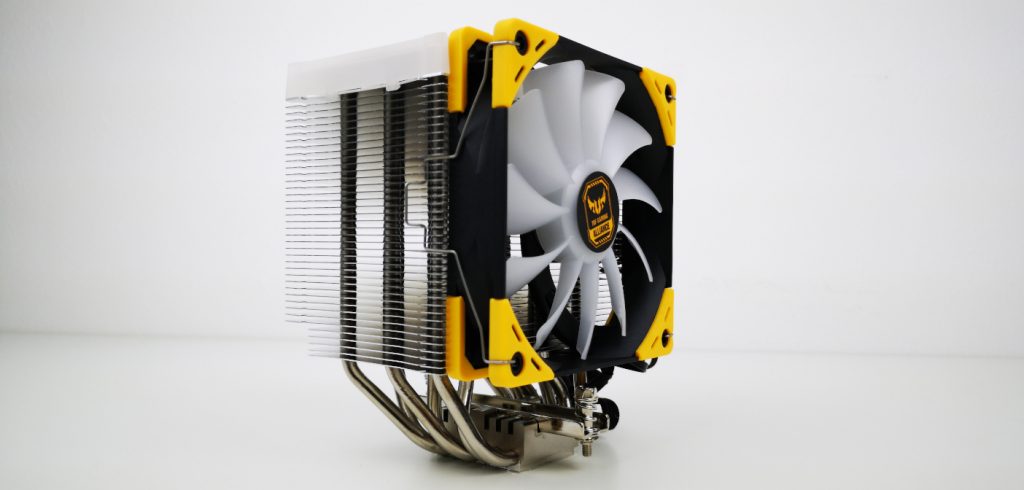 Starten wir mit dem Kühlkörper, hier sehen wir auch gleich den größten Unterschied im Vergleich zum normalen Mugen 5. Denn die TUF Gaming Alliance Variante ist mit einer Kunststoffabdeckung versehen, auf der sich das Logo von TUF Gaming Alliance befindet, dazu kommt noch die darin liegende RGB-Beleuchtung. Diese besitzt einen 4-Pin-Anschluss, der mit 12 Volt betrieben wird. Die Höhe des Towers wir mit 157,5 mm angegeben, somit passt dieser in die meisten ATX-Gehäuse. An den Außenseiten der Alufinnen befinden sich Einkerbungen, diese dienen zur Befestigung des Lüfters. Ein zweiter kann bei Bedarf nachgerüstet werden.