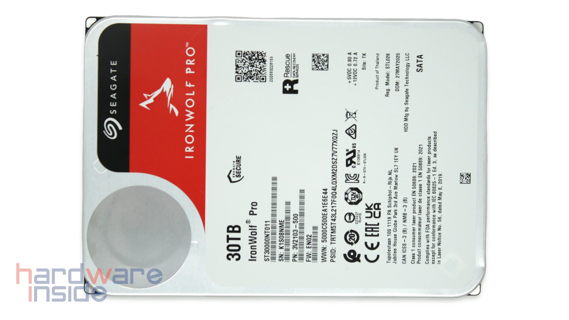 Rein äußerlich betrachtet, handelt es sich bei der Seagate IronWolf Pro (30 TB) um eine 3,5-Zoll Festplatte mit SATA-Interface. Sie ist für den Dauerbetrieb in beliebig großen Festplatten-Raids ausgelegt. Grundsätzlich ist in 15 Varianten in Größen von 2 bis 32 TB erhältlich. Allerdings sind nur die vier Größten Varianten mit der nagelneuen HARM Technologie ausgestattet, konkret sind es folgende SKUs: