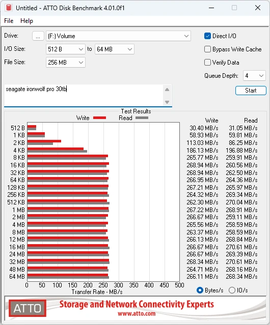 Zur genaueren Untersuchung der Abhängigkeit der IO-Größe setzen wir den ATTO Disk Benchmark ein.