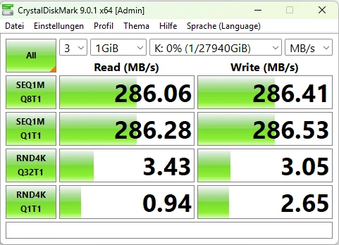 Um einen ersten Überblick über die Leistung zu erhalten, ziehen wir den CrystalDiskMark heran. Unsere Testparameter sind drei Durchläufe mit jeweils 1 GiB.