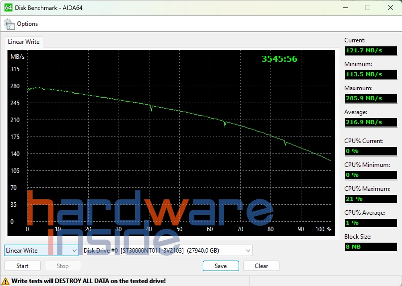 Die Messergebnisse des linearen Schreibtests bestätigen die theoretischen Erwartungen an das 30-TB-Laufwerk: Zu Beginn des Tests, im äußeren Bereich der Platter, erreicht die IronWolf Pro eine Spitzenrate von 285,9 MB/s. Im weiteren Verlauf zeigt sich die für mechanische Festplatten charakteristische degressiv abfallende Kurve, da die Datendichte pro Umdrehung zum inneren Radius hin abnimmt. Über die gesamte Kapazität hinweg ergibt sich eine Durchschnittsgeschwindigkeit von 216,9 MB/s, wobei die Performance am langsamsten Punkt (ganz innen) auf 113,5 MB/s sinkt. Bemerkenswert ist dabei die hohe Konstanz des Schreibvorgangs über die gewaltige Zeitspanne von fast 60 Stunden. Bis auf ein paar einzelne Einbrüche zeigt sich die Leistung in einer vergleichsweise konstanten und nur flach abfallenden Leistungskurve.