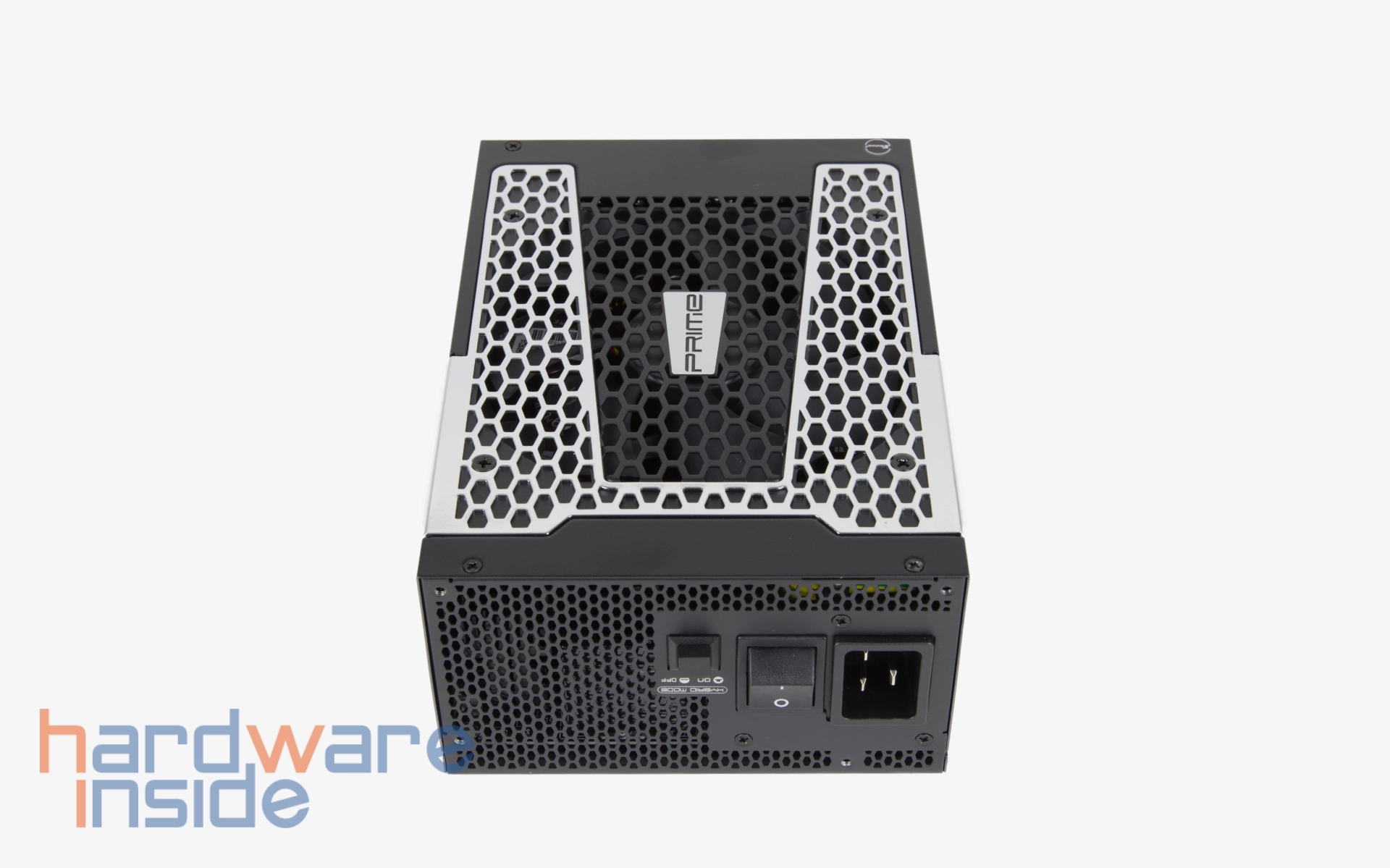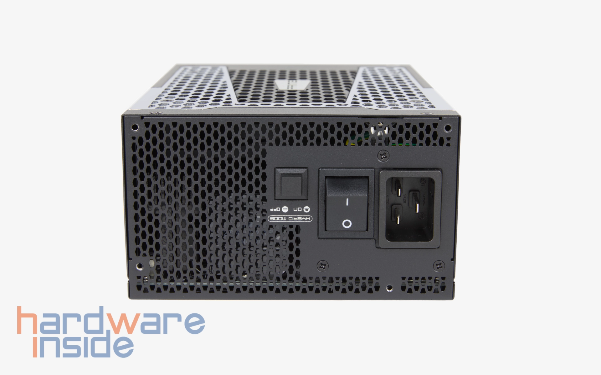 Die Rückseite des Seasonic Prime TX-1300 ist funktional gehalten und verzichtet auf unnötige Designelemente. Neben der Kaltgerätebuchse und dem obligatorischen Hauptschalter fällt vor allem das großflächige Wabengitter auf. Dieses sorgt für einen sehr guten Luftdurchsatz und unterstützt damit die Kühlung der internen Komponenten. Auffällig ist außerdem der Schalter für die digitale Hybrid-Lüftersteuerung, mit dem sich der semi-passive Betrieb aktivieren oder deaktivieren lässt. Damit haben Anwender die Möglichkeit, je nach Systemanforderung zwischen maximaler Laufruhe oder durchgängiger Kühlung zu wählen.