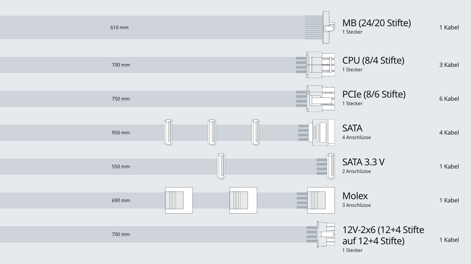 | 24-Pin ATX | 1 | 610 mm | Mainboard-Stromversorgung |