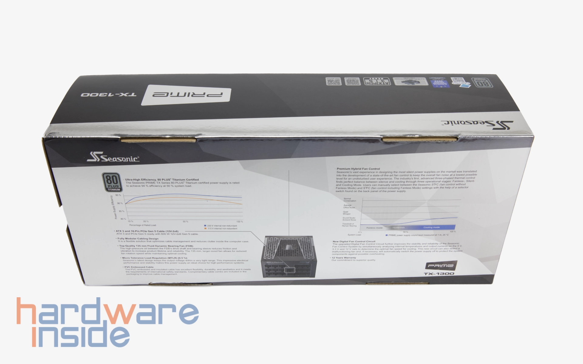 Die Rückseite liefert deutlich mehr technische Details. Neben Effizienzkurven und Diagrammen zur Spannungsstabilität werden hier zentrale Features wie die digitale Hybrid-Lüftersteuerung, das vollmodulare Kabelmanagement sowie das native 12V-2×6-Kabel erläutert. Auch eine schematische Darstellung der Anschlussmöglichkeiten ist vorhanden. Insgesamt wirkt die Verpackung informativ und zugleich edel, sodass bereits beim Auspacken klar wird, dass es sich beim TX-1300 um ein Netzteil der Spitzenklasse handelt.