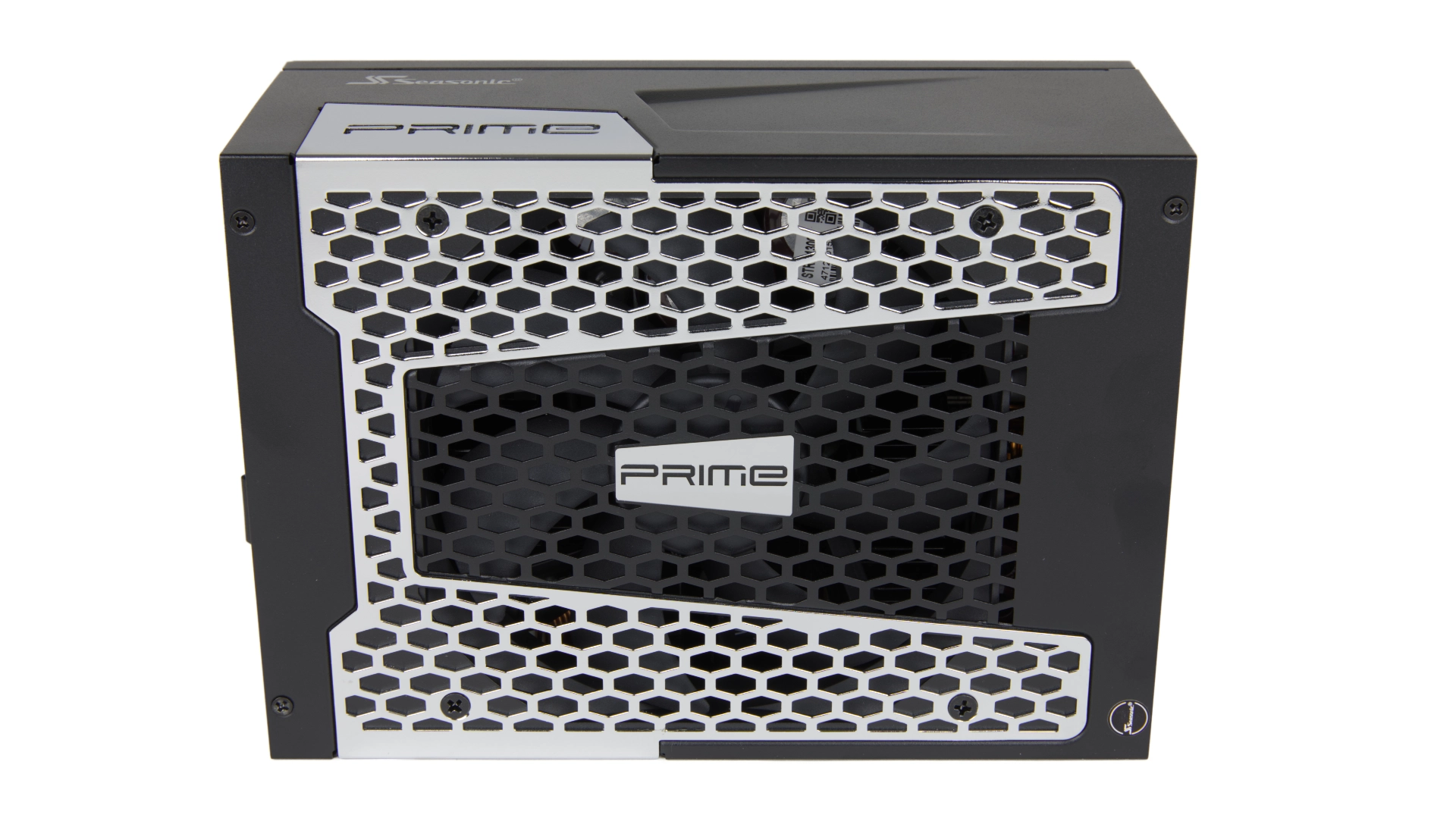 In der Gesamtansicht wird deutlich, dass es sich beim Seasonic Prime TX-1300 um ein Netzteil der Oberklasse handelt. Mit 210 mm Länge überragt es die gängigen ATX-Modelle und erfordert daher ausreichend Platz im Gehäuse. Optisch setzt Seasonic auf eine besonders auffällige Gestaltung: Die Seitenteile tragen silberne, kantig gestaltete Elemente mit Prime-Logo, die sich deutlich von den sonst meist schlichten, schwarzen Netzteilen am Markt abheben. Diese Optik vermittelt bereits auf den ersten Blick einen hochwertigen Eindruck und passt damit auch in Systeme, bei denen das Netzteil durch ein Seitenfenster sichtbar bleibt.