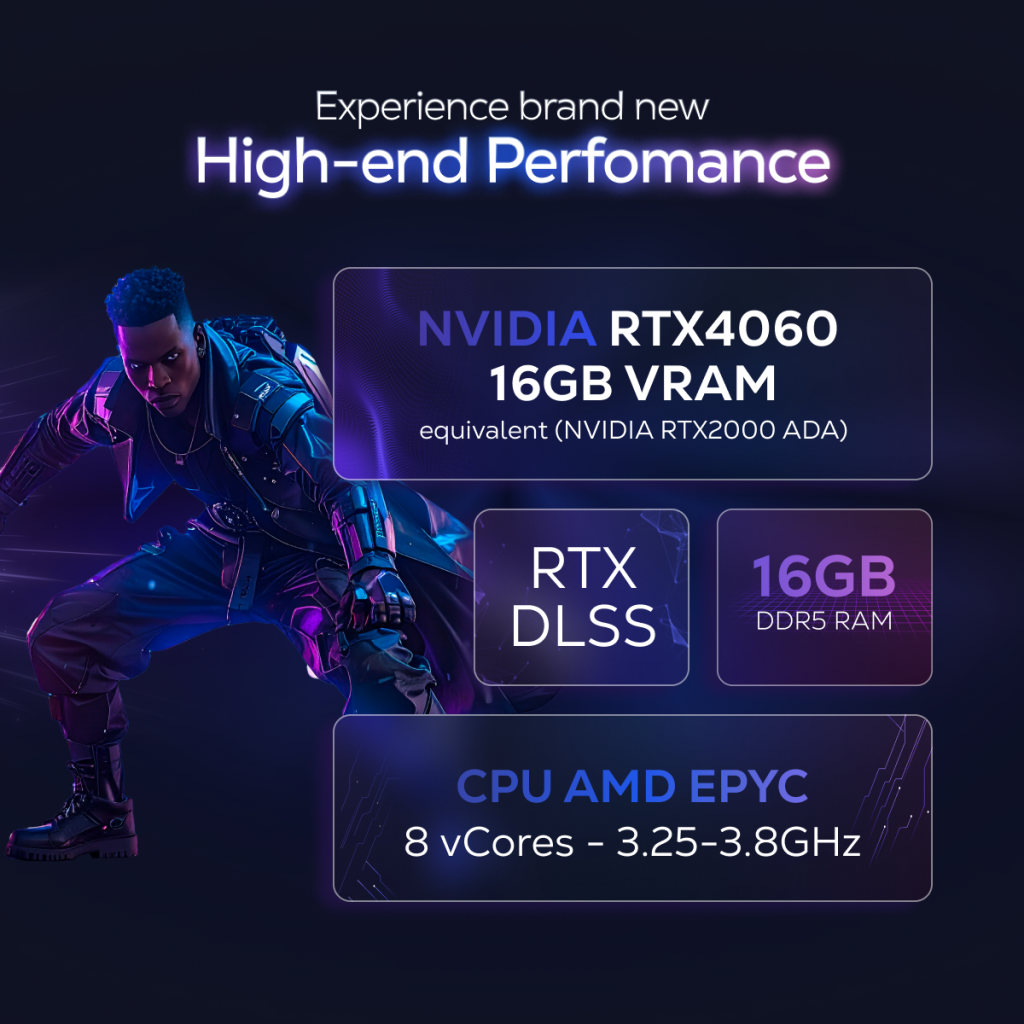 - GPU: Äquivalent zu NVIDIA RTX 4060 16GB (Server-grade NVIDIA RTX 2000 ADA 16GB)