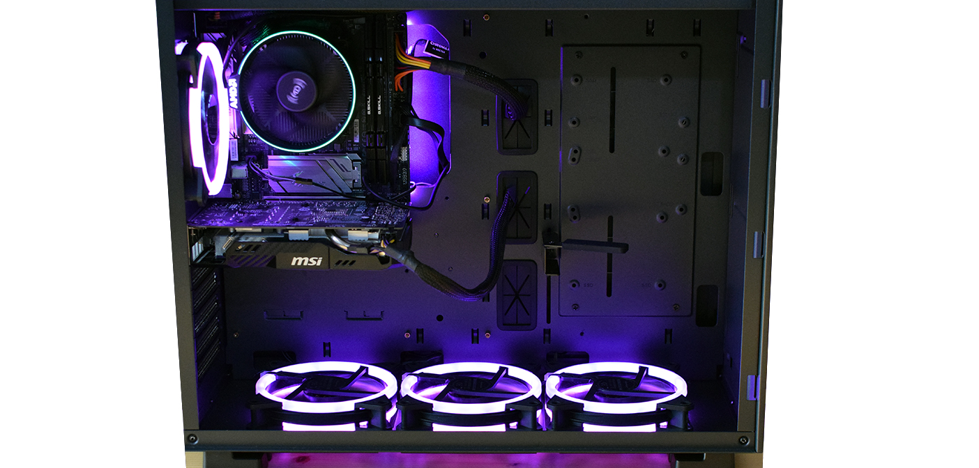 Im Boden finden wir die drei adressierbaren 120 mm RGB-Lüfter. Ein Weiterer ist neben dem I/O-Shield oberhalb der PCIe Slots zu finden. Jeder Lüfter wird per Daisy-Chain aneinandergekoppelt, um jeden Lüfter mit einem einzigen 4-Pin-Molex mit Strom zu versorgen. Die RGB-Steuerungskabel verlegen wir parallel zur Rückseite. Ausgestattet mit gummierten Pads sind die Lüfter gut entkoppelt. Sie besitzen einen beidseitigen LED-Ring, was eine gleichmäßige Beleuchtung gestattet.