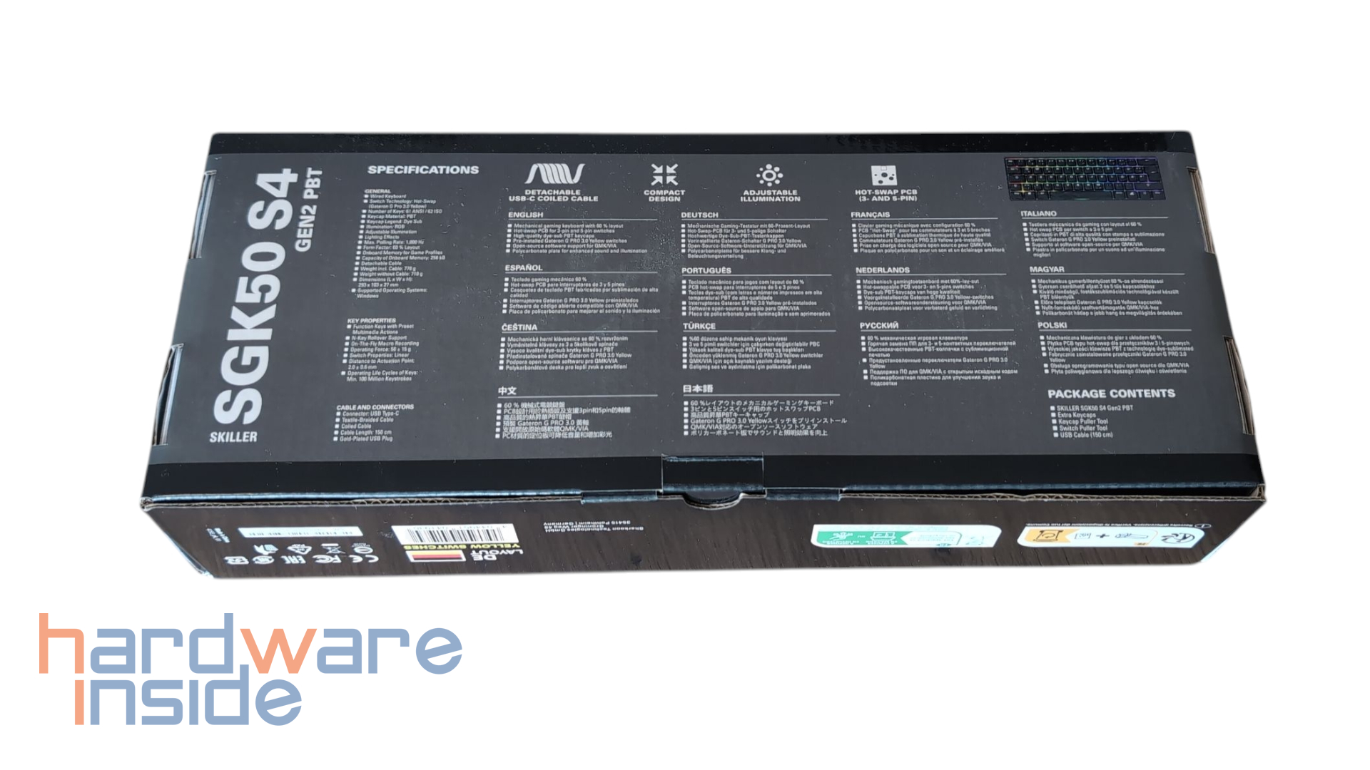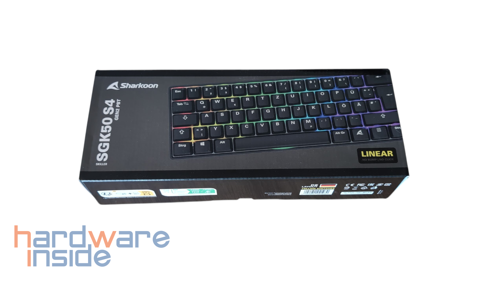Die Sharkoon SKILLER SGK50 S4 Gen2 PBT kommt in einer dunklen Verpackung. Auf der Front sind Herstellerlogo, Produktbezeichnung, eine Abbildung der Tastatur sowie ein Hinweis, dass lineare Switches verbaut sind. Auf der Rückseite sind die technischen Daten zu sehen, zudem werden die Features in mehreren Sprachen kurz beschrieben.