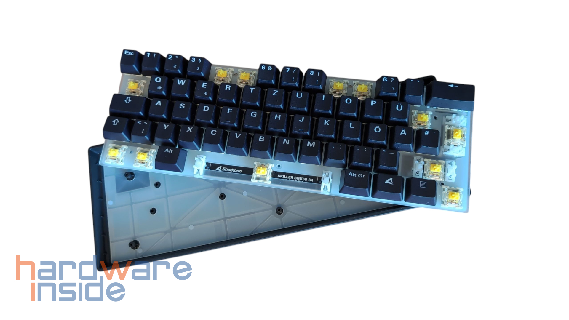 Im Inneren der SKILLER SGK50 S4 Gen2 PBT ist eine Positionierungsplatte aus Polycarbonat sowie eine doppellagige Silikondämpfungsmatte, was zu einem eher tiefen und gedämpften Klang führt und hohe Frequenzen reduziert. Auch die PBT-Tastenkappen tragen mit ihrer dickeren Wandstärke dazu bei.