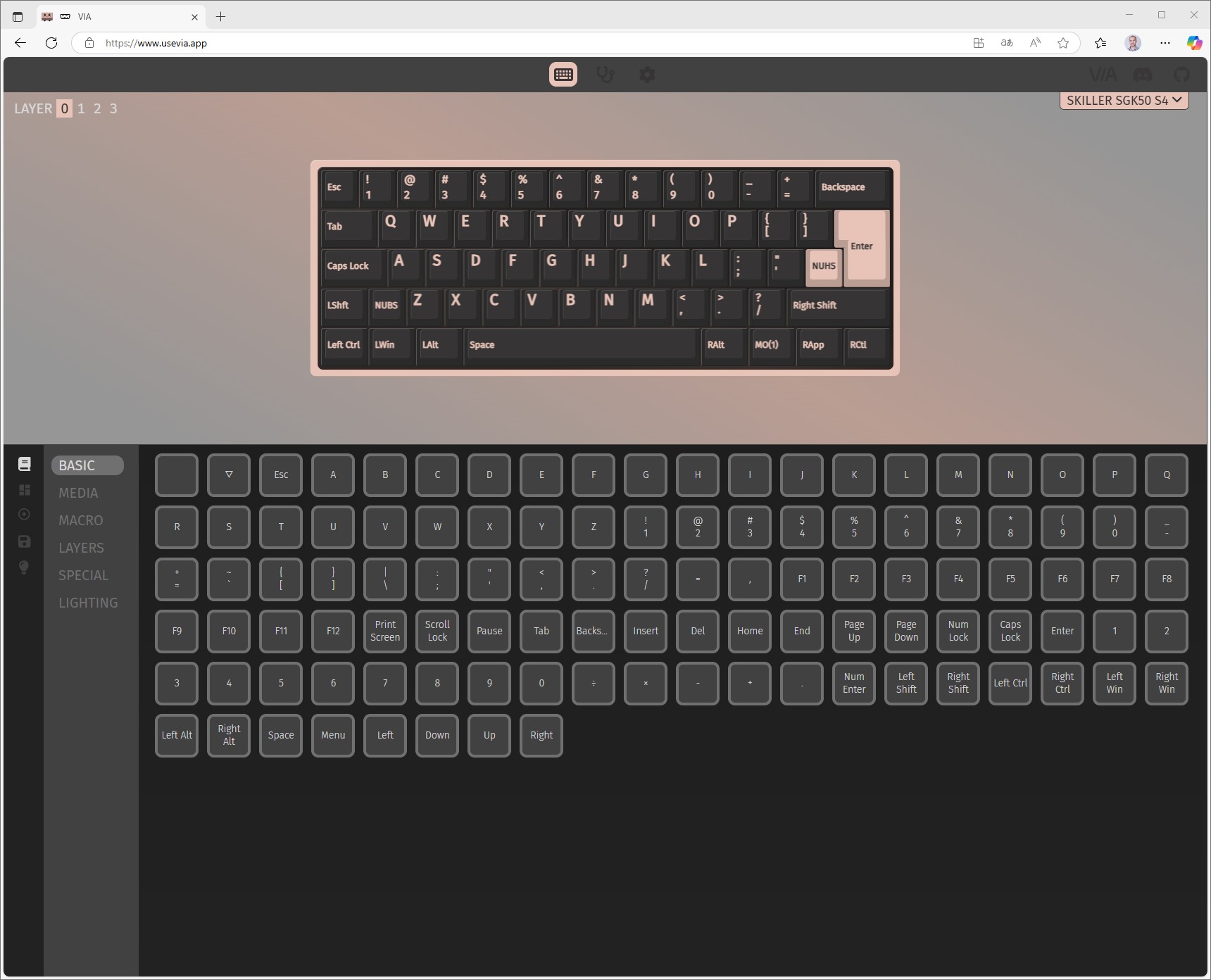 Die VIA-Webapp ist eine browserbasierte Open-Source-Software, mit der sich das gesamte Layout und alle Funktionen der Tastatur ohne klassische Hersteller-Software anpassen lassen. Nachdem die Sharkoon SGK50 S4 Gen2 via USB mit dem PC verbunden wurde, wird sie von VIA automatisch erkannt. Im ersten Reiter erscheinen visuell die belegbaren Tasten. Es können mit wenigen Klicks jede Taste beliebig neu belegt werden, wie etwa die Mediensteuerung, Makros, spezielle Windows-Funktionen oder selbst komplexe Befehlsketten. Neben den Hauptbelegungen sind auch mehrere Ebenen konfigurierbar, sodass Tasten doppelt oder dreifach mit Funktionen belegt werden können.