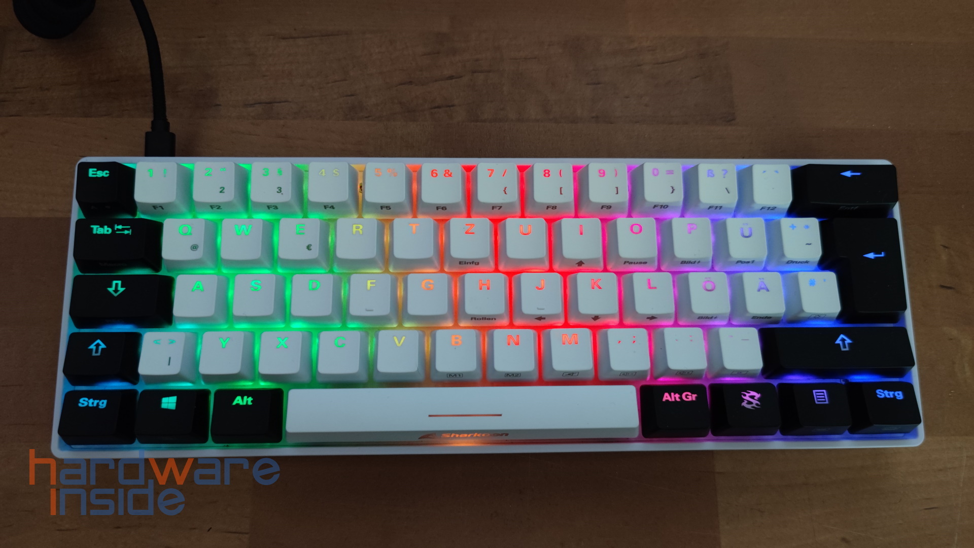 Auch wenn es sich bei der uns vorliegenden Sharkoon SKILLER SGK50 S4 um die weiße Version handelt, ist diese nicht komplett in Weiß gehalten. Das Kunststoffgehäuse sowie der überwiegende Teil der Tasten ist in Weiß gehalten, einige sind jedoch schwarz. Die Tasten bestehen aus ABS-Kunststoff und sind konkav geformt. Einige Tasten sind mit weiteren Funktionen belegt, so finden wir zum Beispiel bei den Tasten 1 bis ´` als dritte Funktion die Funktionstasten F1 bis F12. Die zusätzliche Funktion ist an der Seite der Tastenkappe aufgedruckt. An der Seite der Leertaste ist das Sharkoon-Logo untergebracht. Auf der Rückseite der Tastatur befindet sich seitlich der USB-Typ-C Anschluss.![]()