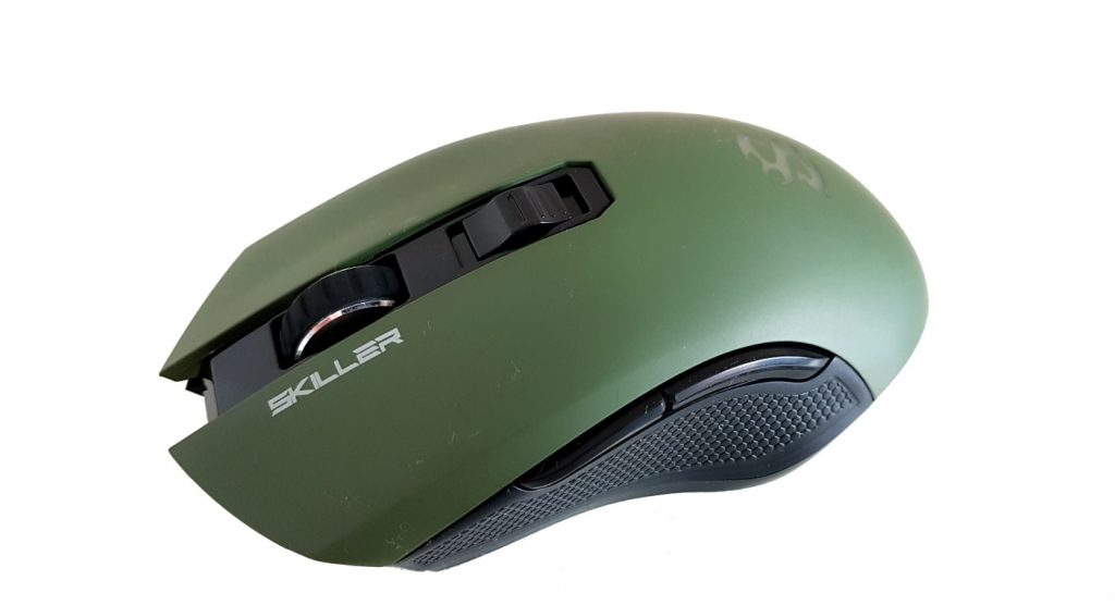 Die Oberseite ist, wie eingangs schon erwähnt, in einem matten Oliv gehalten. Auf der linken Haupttaste ist ein kleines Skiller-Logo aufgedruckt. Die Vorderseite der Maus ist kantig gestaltet, was ihr einen aggressiven Look verleiht. Unterstrichen wird dies noch von der breiten Trennung zwischen den beiden Haupttasten. Diese setzt sich farblich ab und beherbergt ein gummiertes Mausrad zwei Tasten dahinter. Etwas weiter unten ist ein Micro USB Anschluss an der Vorderseite untergebracht, hier lässt sich das mitgelieferte Kabel zum Laden des Akkus einsetzen. Natürlich kann die Maus auch mit eingestecktem Kabel genutzt werden.![]()