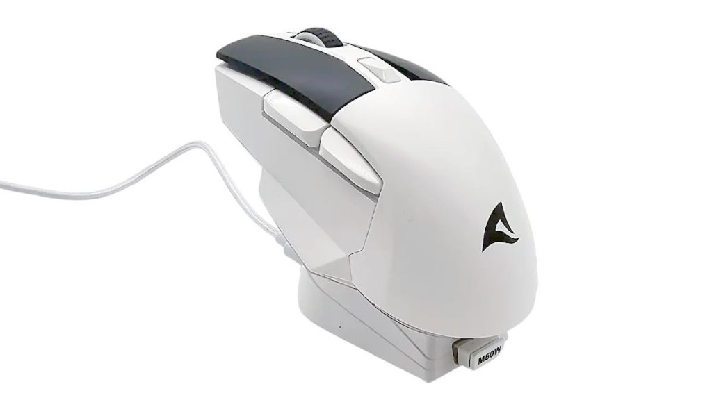 Die Sharkoon SKILLER SGM50W kommt mit einer kompakten Ladestation. An der Rückseite verfügt diese über einen USB-Typ-C-Anschluss und an der Vorderseite einen USB-Typ-A-Anschluss. Auf der Oberseite befinden sich zwei Kontakte, welche auf die Kontakte in der Maus zugreifen. Die Maus hält durch die Formgebung der Ladestation auf der Station.