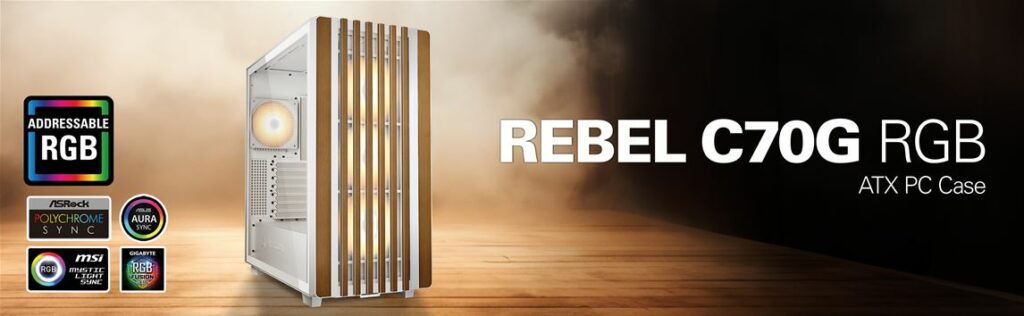 Mit seiner eleganten Frontblende mit Holzverkleidung und dem schraubenlosen Seitenteil aus gehärtetem Glas setzt das Rebel C70G RGB stilvolle Akzente im Gaming-, Wohn- oder Arbeitszimmer. Zahlreiche Perforationen im Gehäuse sowie modulare Einbauoptionen schaffen Platz für bis zu elf 120-Millimeter-Lüfter oder zwei Radiatoren und sorgen neben einer herausragenden Optik für eine optimale Kühlleistung selbst für Highend-Setups. Mit zukunftssicheren USB-C- und TRRS-Anschlüssen wird auch die Produktivität jederzeit optimal unterstützt.