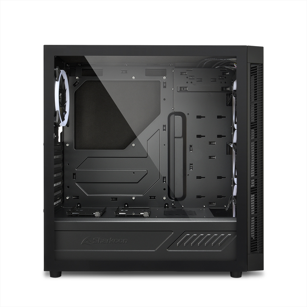 Die gehärtete Frontscheibe gewährt freie Sicht auf die drei in der Front verbauten, beleuchteten RGB-LED-Lüfter. Das aus gehärtetem Glas gefertigte Seitenteil hingegen gibt den Blick frei auf das Innere des Gehäuses und die dort verbauten Komponenten. Das Seitenteil wird zur Befestigung in einen Rahmen gehängt und an der Rückseite verschraubt, sodass keinerlei sichtbare Schrauben die Optik beeinflussen.