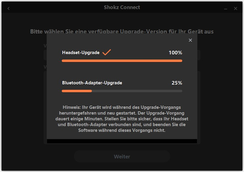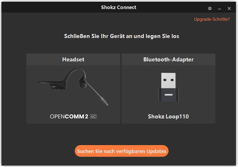 Für den PC oder MAC bietet SHOKZ mit der Connect App eine Möglichkeit, die Updates direkt auf das Headset und über den Dongle zu installieren. Die Bedienung erfordert keinerlei Sonderkenntnisse. In unserem Fall wird direkt ein Update gefunden und durchgeführt.