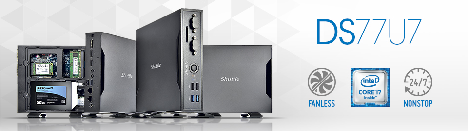 Elmshorn, Deutschland, 2017-06-02 – Nach dem bereits alle Shuttle XPCs mit Sockel-Prozessoren per BIOS-Update für Intels siebte Generation startklar sind, folgt nun die komplett lüfterlose DS77-Modellreihe. Insgesamt stehen wieder vier Modelle mit aufgelöteten Prozessoren vom energiesparenden Celeron bis hin zum leistungsstarken i7 zur Verfügung.