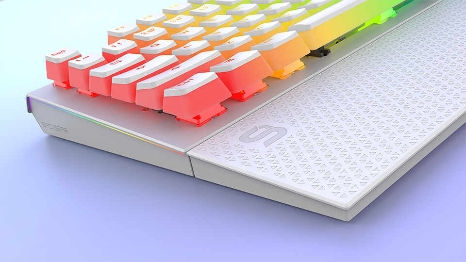 Um die Ergonomie der Tastatur sowohl im Alltag als auch bei Gaming-Sessions zu verbessern, ist im Lieferumfang der GK650K eine Handballenauflage enthalten. Magnetische Halterungen sowie spezielle Rillen im Gehäuse ermöglichen einfache Befestigung und Abnahme. Je nach Vorliebe des Benutzers kann die Handballenauflage in beliebiger Entfernung von der Tastatur angebracht werden, wobei breite Gummifüße das Pad auf dem Schreibtisch stabilisieren. Die dreieckigen Rillen auf der Oberseite der Handballenauflage verbessern nicht nur die Ergonomie, sondern werten auch das Aussehen der Tastatur auf.