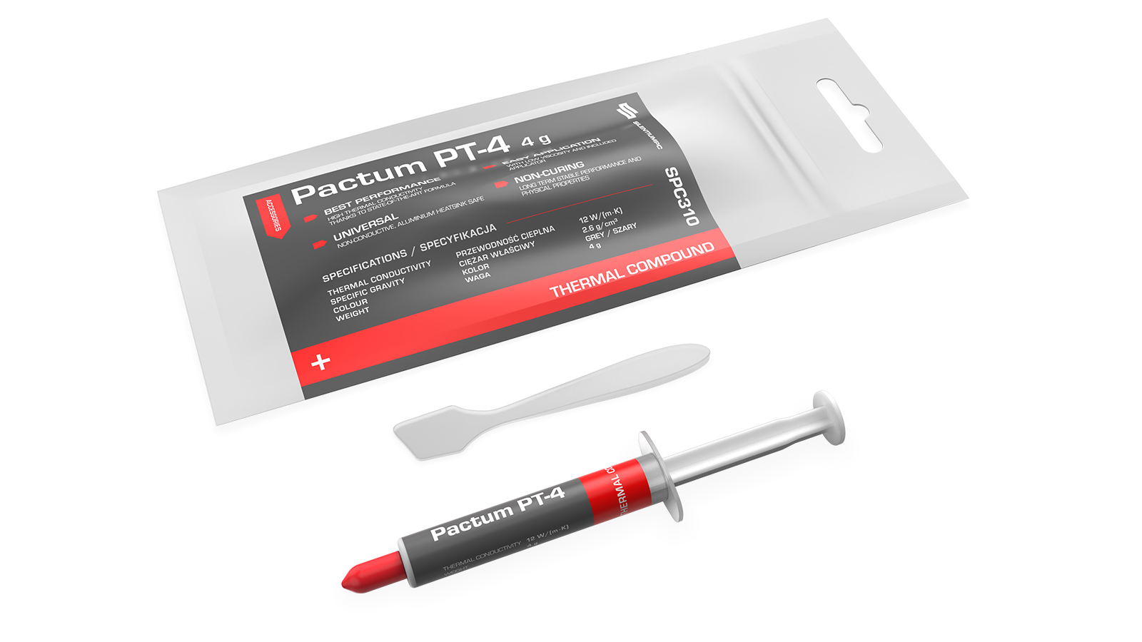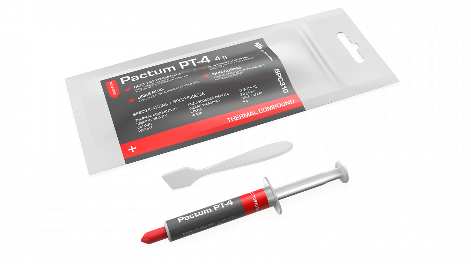 30.06.2021 – Warschau, Polen – SilentiumPC, der europäische Hersteller von CPU-Kühlern, Netzteilen und PC-Gehäusen, präsentiert die neue Hochleistungs-Wärmeleitpaste Pactum PT-4 für PC-Enthusiasten. Der größte Vorteil von Pactum PT-4 gegenüber den meisten Konkurrenzprodukten ist die hohe Wärmeleitfähigkeit von 12 W(m·K). Sie ermöglicht es den Anwendern, die thermische Leistung von CPU- als auch Grafikkarten-Kühlsystemen zu verbessern. Pactum PT-4 erhält seine exzellenten Eigenschaften dank der neuen, verbesserten Formel und dem Einsatz einer Zusammensetzungen aus Zink und Aluminium. Die neue Hochleistungs-Wärmeleitpaste ist wahlweise in einer 1,5- oder 4-Gramm-Variante erhältlich.