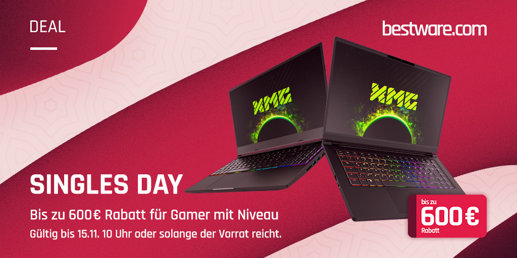 Vom 11. November um 10 Uhr bis zum 15. November um ebenfalls 10 Uhr gilt bei bestware.com das Motto „Bis zu 600 Euro Rabatt für Gamer mit Niveau“. Dementsprechend umfasst die Rabattaktion zum Singles Day thematisch passend verschiedene High-End-Laptops von XMG, der Preisnachlass ist je nach gewählter Grafikkarte gestaffelt. Ausgewählte Notebooks mit einer NVIDIA GeForce RTX 3070 gibt es 400 Euro günstiger, bei einigen Modellen mit einer RTX 3080 oder 3080 Ti beträgt der Preisnachlass sogar 600 Euro. Wird zusätzlich zu einem kompatiblen Laptop im Konfigurator die Laptop-Wasserkühlung XMG OASIS ausgewählt, kostet diese im Aktionszeitraum 149 statt der sonst üblichen 199 Euro.