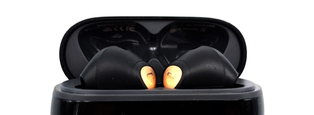 Wir sind eher Earbuds gewöhnt, welche samt Polster im Gehörgang sitzen. Daher ist es anfänglich etwas gewöhnungsbedürftig, dass dieser Kopfhörer relativ locker im Ohr sitzt. Das fühlt sich allerdings nur so an, denn in der Praxis zeigt sich, dass die Earbuds sicher im Ohr sitzen und auch hektischeren Bewegungen standhalten. Nach einiger Zeit verfliegt das Gefühl des lockeren Sitzens und wir spüren die Earbuds kaum noch. Das dürfte vor allem dem geringen Gewicht geschuldet sein. Praktisch ist übrigens die Trageerkennung, denn sobald die Earbuds herausgenommen werden, stoppt die Wiedergabe und setzt fort, wenn die Buds wieder im Ohr sind.