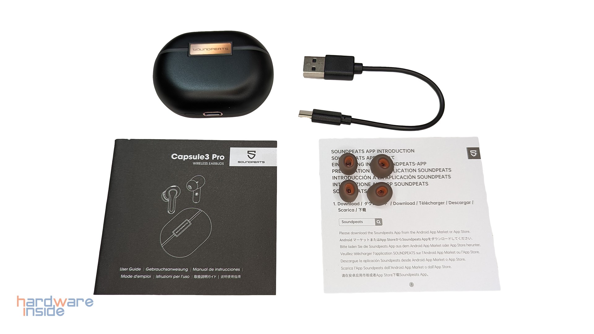 Die SOUNDPEATS Capsule3 Pro befinden sich, wie bereits erwähnt, in der Ladeschale und sind bereits mit zwei mittelgroßen Ohrpassstücken bestückt. Vier weitere dieser Ohrpassstücke befinden sich in einem kleinen Plastikbeutel. Zum Aufladen liegt ein kurzes USB-Kabel mit Typ-C Stecker bei. Eine Bedienungsanleitung und Anweisung für die App liegen bei.