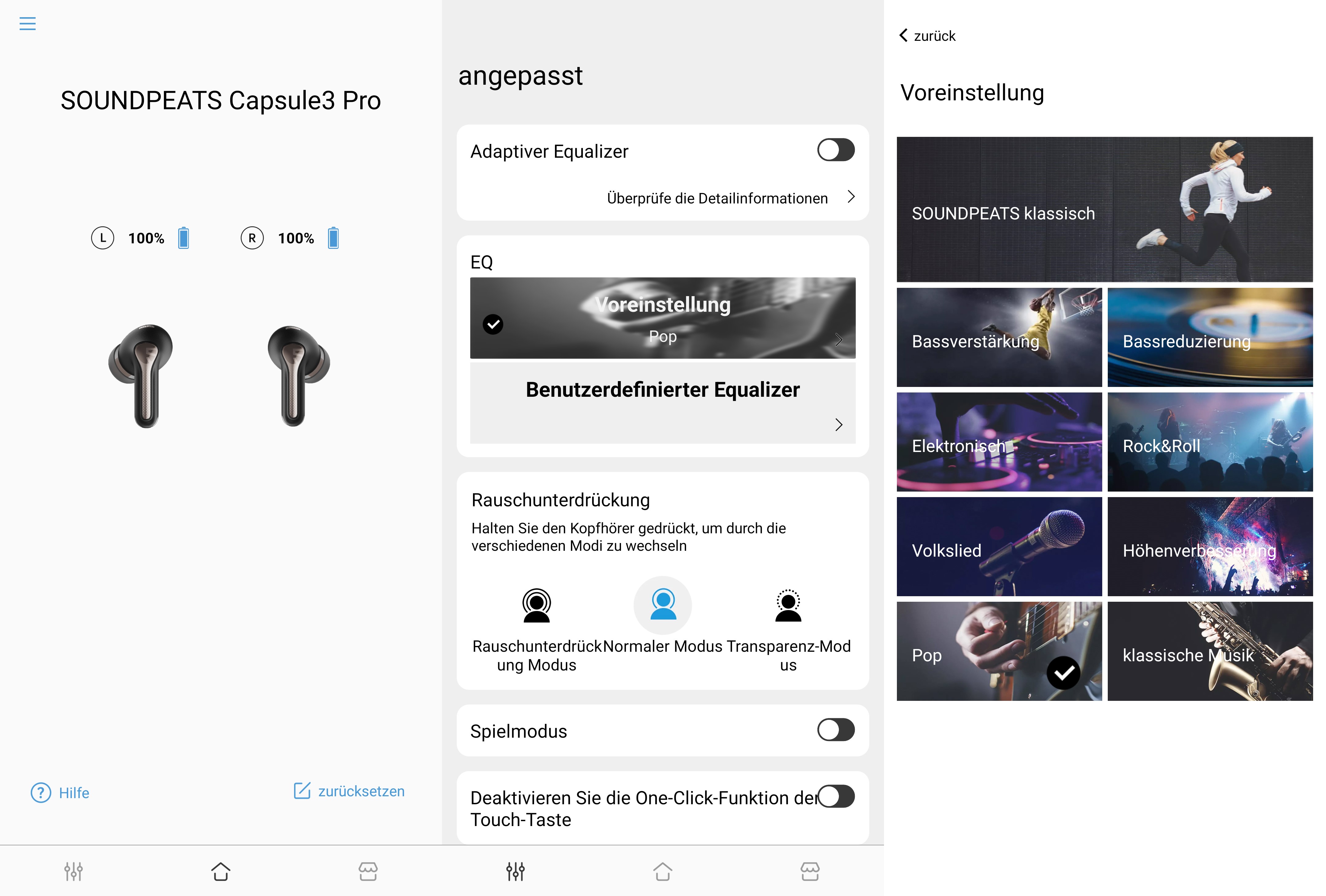 Um die SOUNDPEATS Capsule3 Pro nutzen zu können, muss die App nicht installiert werden. Um das Beste aus den Kopfhörern herauszuholen, ist sie jedoch unerlässlich. Leider muss man sich bei der App explizit anmelden – und zwar mit einem eigenen Account, also keine Schnellanmeldung über Google oder Apple. Neben dem Batteriestatus der einzelnen Buds, nicht aber des Case, können wir hier auch die aktive Geräuschunterdrückung ein- und ausschalten. Für die ANC gibt es zwei Modi – Aktive Geräuschunterdrückung und Transparenzmodus. Diese Einstellung ist jedoch nur möglich, wenn beide Kopfhörer aktiv sind, nicht wenn nur ein Kopfhörer getragen wird. Außerdem kann hier der Gaming-Modus aktiviert werden, der eine Latenz von 70 ms ermöglicht. Ebenso kann hier der Equalizer mit acht vordefinierten Einstellungen eingestellt oder ein eigenes Profil erstellt werden.
