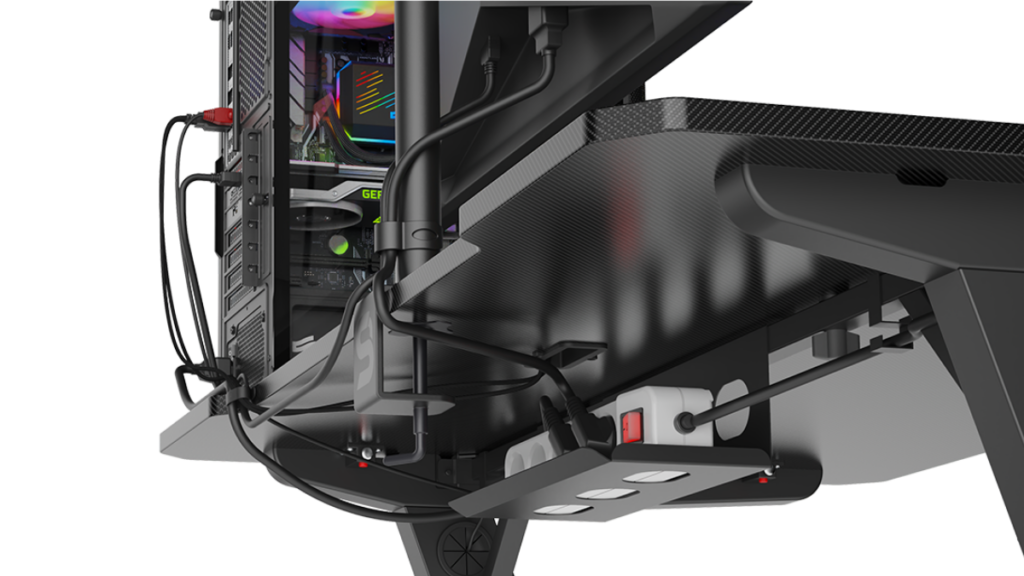 Der GD100 Gaming-Tisch verfügt über zwei breite Stahlbeine und eine hölzerne Tischplatte, die mit zusätzlichen Stützen verstärkt ist und so eine sehr stabile Basis für den Schreibtisch bildet. Das breite Profil der Beine sorgt für Stabilität und die abschraubbaren Gummipuffer schützen den Boden und ermöglichen eine einfache Justierung des Tisches. Die schwarze Schreibtischoberfläche ist mit einer Beschichtung versehen, die im schönen Karbondesign daherkommt. Neben der tollen Optik ist die Oberfläche des Schreibtisches auch widerstandsfähiger gegen Kratzer, so dass der Gaming-Tisch über Jahre hinweg genutzt werden kann. Außerdem bietet sie eine verbesserte Griffigkeit für Mauspads, wodurch es weniger Ablenkungen gibt und die Genauigkeit erhöht wird.