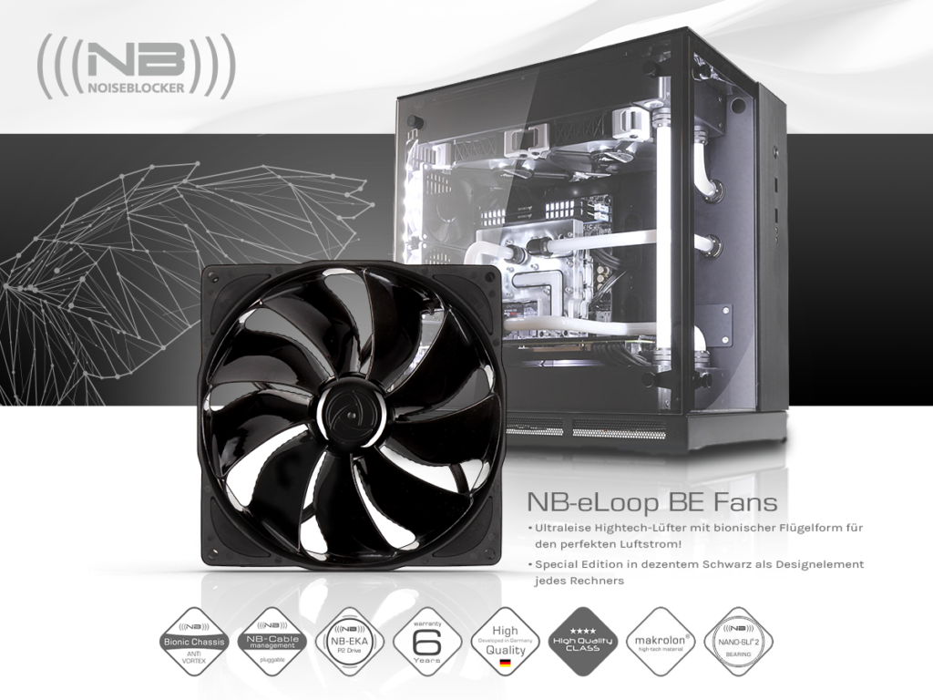Noiseblocker ist ein deutscher Spezialist für Silent-Hardware mit besonderer Fixierung auf Silent-Lüfter. Bei der eLoop-Serie werden daher bionische Lüfter mit einzigartiger Flügelform eingesetzt, die eine deutlich niedrigere Lautstärke haben als vergleichbare Axiallüfter. Bei der Entwicklung der “leisesten Lüfter der Welt” erhielt Noiseblocker eine Förderung des Bundesministeriums für Wirtschaft und Technologie, um die Forschungsergebnisse des Bionikers Dr. Rudolf Bannasch praxisreif zu machen.