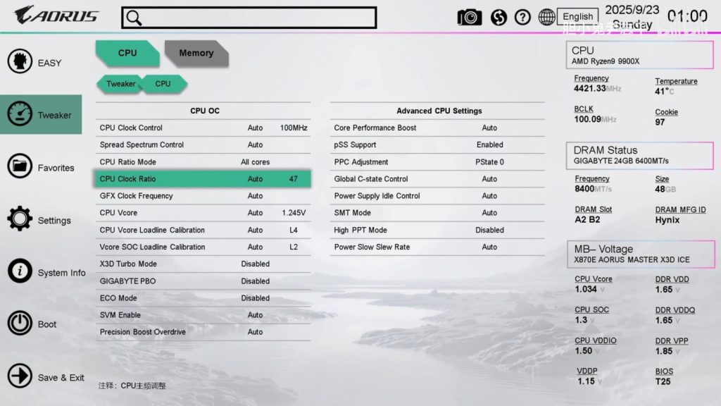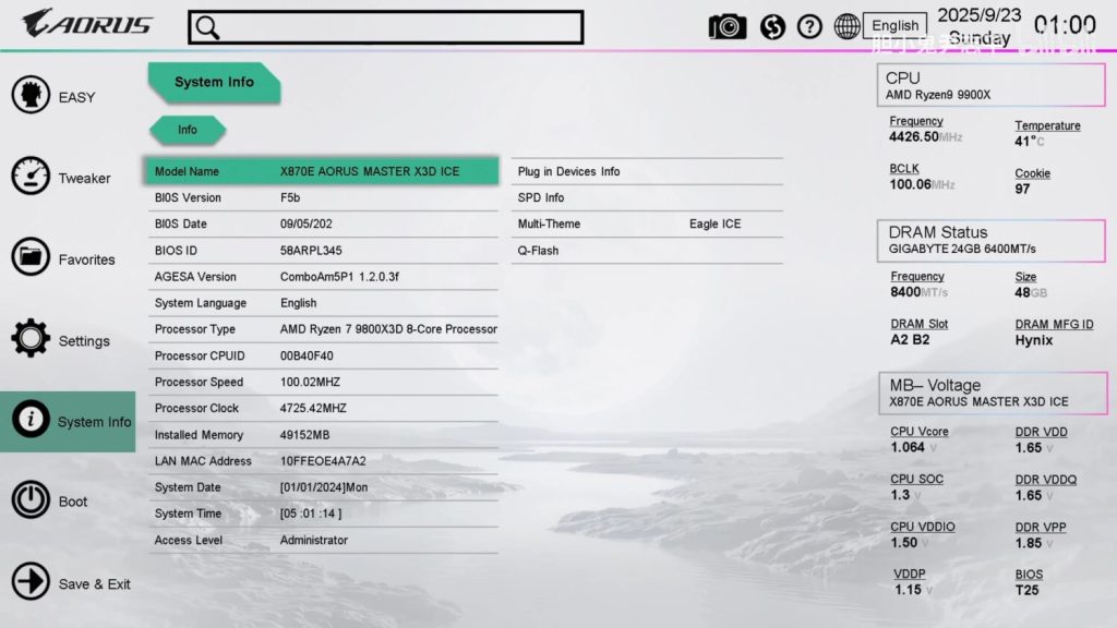 Die Systemdaten deuten auf ein X870E AORUS MASTER X3D ICE-Board mit Ryzen 9 9900X und 48 GB DDR5 (Hynix) hin. Das angeblich neue UEFI führt „X3D 2.0“, „PBO“ und ein bislang unbekanntes Feature namens „Cookie Score“ auf – laut Uniko’s Hardware wohl ein KI-gestütztes CPU-Bewertungstool von Overclocking-Legende HiCookie.