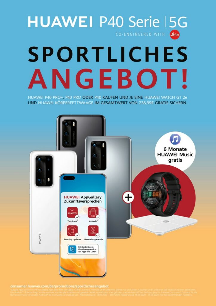 Düsseldorf, 17. Juni 2020 – Aktiv im Sommer unterwegs mit HUAWEI: unter dem Motto „SPORTLICHES ANGEBOT“ läutet das Unternehmen seine Sommeraktion ein. Alle Käufer eines neuen Smartphones der HUAWEI P30-Serie oder der HUAWEI P40-Serie erhalten neben einer HUAWEI Smartwatch die passende HUAWEI Körperfettwaage. Aber damit nicht genug: Für die musikalische Untermalung und zur Steigerung der Motivation beim Sport gibt es sechs Monate HUAWEI Music dazu – alles im Gesamtwert von bis zu 328 Euro. Das Angebot gilt bis einschließlich 31. Juli 2020.