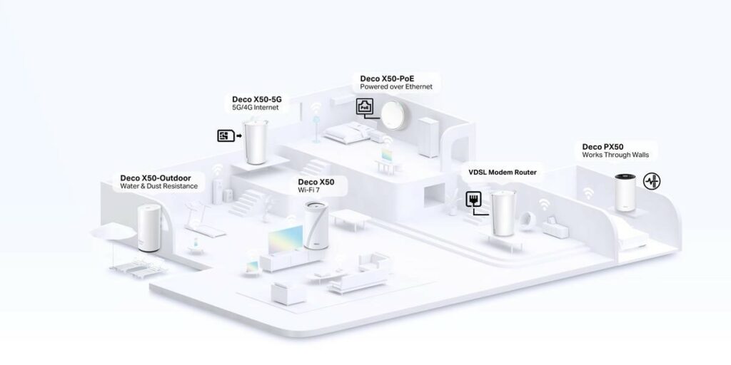 Ist der Internetzugang auf einem der oben beschriebenen Wege erst einmal dort angekommen, wo er zunächst gebraucht wird, sind die weiteren Möglichkeiten vielfältig – und TP-Link hat für beinahe jedes Szenario das passende Produkt im Portfolio: schnelles WLAN auch im Obergeschoß oder im hinteren Teil der Wohnung? Einfach weitere Access-Points der Deco-X50-Serie (oder jeder anderen Deco-Modellreihe) dem Mesh hinzugefügt, schon steht nahtloses WiFi 6 in der gesamten Wohnung zur Verfügung. Keine Steckdose am gewünschten Installationsort für einen Access-Point vorhanden? Der Deco X50-PoE (Power over Ethernet) kann direkt über das LAN-Kabel mit Strom versorgt werden. Der Deco PX50 lässt sich auch von dicken Wänden nicht stoppen und kann so das Mesh-WLAN auch in abgeschiedene Räume bringen, die sonst notorisch schwer mit kabellosem Netz zu versorgen sind. Und wenn schnelles und stabiles WLAN auch in Außenbereichen wie Gärten oder Terrassen gewünscht ist, dann leistet der Deco X50-Outdoor mit seiner IP65 (staub- und wassergeschützt) dort perfekte Dienste. Und wer zum Beispiel im Entertainment-Bereich oder im Home-Office die Internetleitung voll ausreizen muss oder möchte, der findet in den neuen WiFi-7-fähigen Modellen Deco BE85, BE65 und weiteren künftig verfügbaren Geräten, Router und Access Point, die bis zu 19 Gbps in 12 Streams und über 3 Frequenzbänder erlauben. Mehr Speed geht dann kabellos fast nicht mehr.