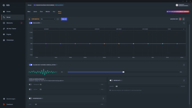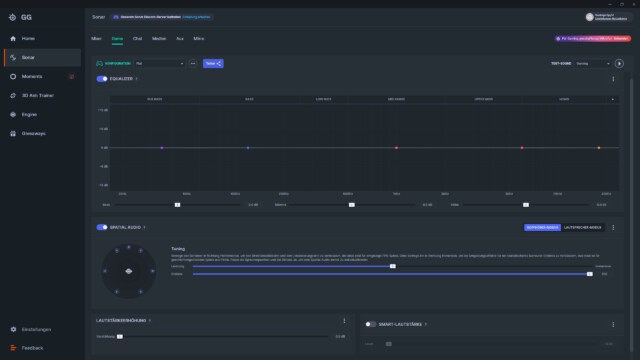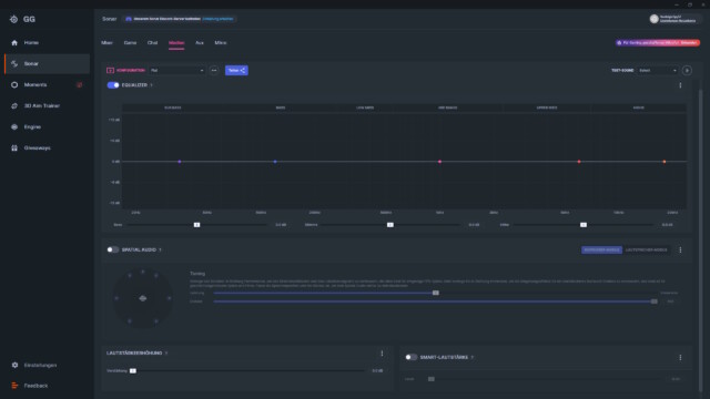 Auf der nächsten Seite namens „Sonar“ gelangen wir zu den umfangreichen Einstellungsmöglichkeiten. Am Anfang wirkt das Ganze noch übersichtlich, denn im Bereich „Mixer“ erwarten uns lediglich einige Schieberegler für die Soundwiedergabe und die Aufnahme. Auch der Chatmix lässt sich dort einstellen. Anschließend können wir in den folgenden Untermenüs Feineinstellungen vornehmen. Alle folgenden Untermenüs sehen recht ähnlich aus. Wichtig ist hier das Dropdownmenü neben dem Wort „Konfiguration“, denn hier befinden sich Voreinstellungen zu über 100 Spielen und vordefinierte Equalizer Einstellungen, die wir auch von anderen Headsets kennen. Rechts oben lässt sich dann ein längerer Soundclip abspielen, um die Konfiguration probehören zu können. Es ist allerdings auch möglich, den Equalizer manuell einzustellen. Wichtig ist auch das Spatial Audio, welches einen virtuellen 7.1 Surround Sound bietet. Auch diese Funktion lässt sich noch im Detail einstellen.