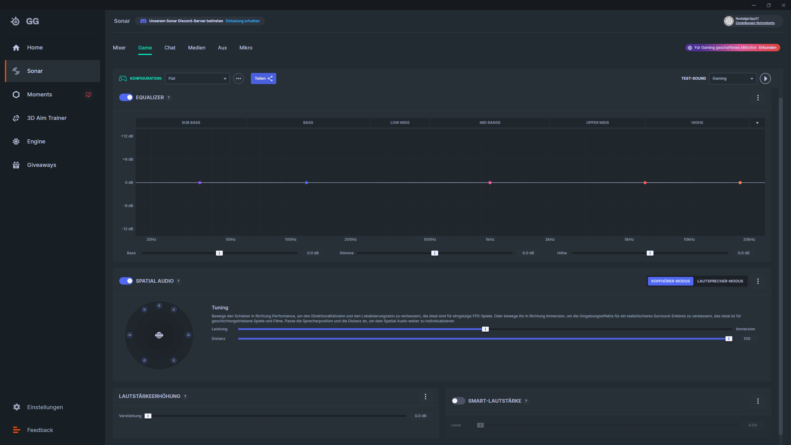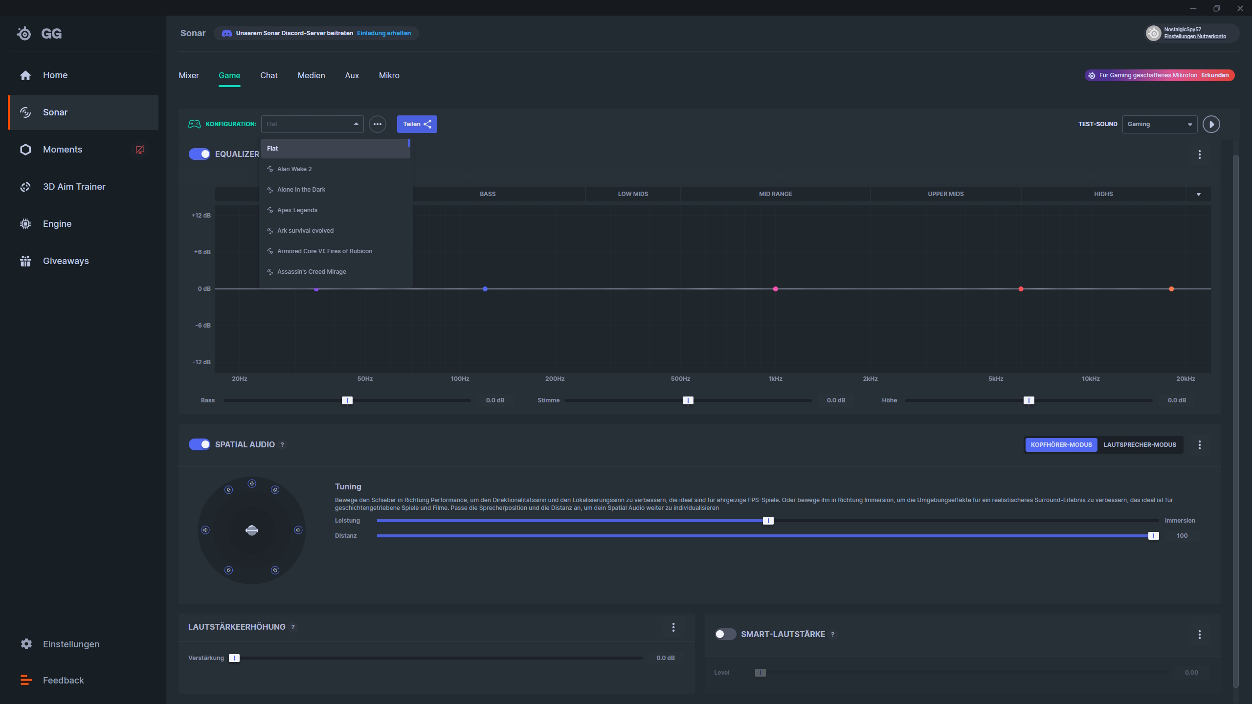 Auf der nächsten Seite namens „Sonar“ gelangen wir zu den umfangreichen Einstellungsmöglichkeiten. Am Anfang wirkt das Ganze noch übersichtlich, denn im Bereich „Mixer“ erwarten uns lediglich einige Schieberegler für die Soundwiedergabe und die Aufnahme. Auch der Chatmix lässt sich dort einstellen. Anschließend können wir in den folgenden Untermenüs Feineinstellungen vornehmen. Alle folgenden Untermenüs sehen recht ähnlich aus. Wichtig ist hier das Dropdownmenü neben dem Wort „Konfiguration“, denn hier befinden sich Voreinstellungen zu über 100 Spielen und vordefinierte Equalizer Einstellungen, die wir auch von anderen Headsets kennen. Rechts oben lässt sich dann ein längerer Soundclip abspielen, um die Konfiguration probehören zu können. Es ist allerdings auch möglich, den Equalizer manuell einzustellen. Wichtig ist auch das Spatial Audio, welches einen virtuellen 7.1 Surround Sound bietet. Auch diese Funktion lässt sich noch im Detail einstellen.