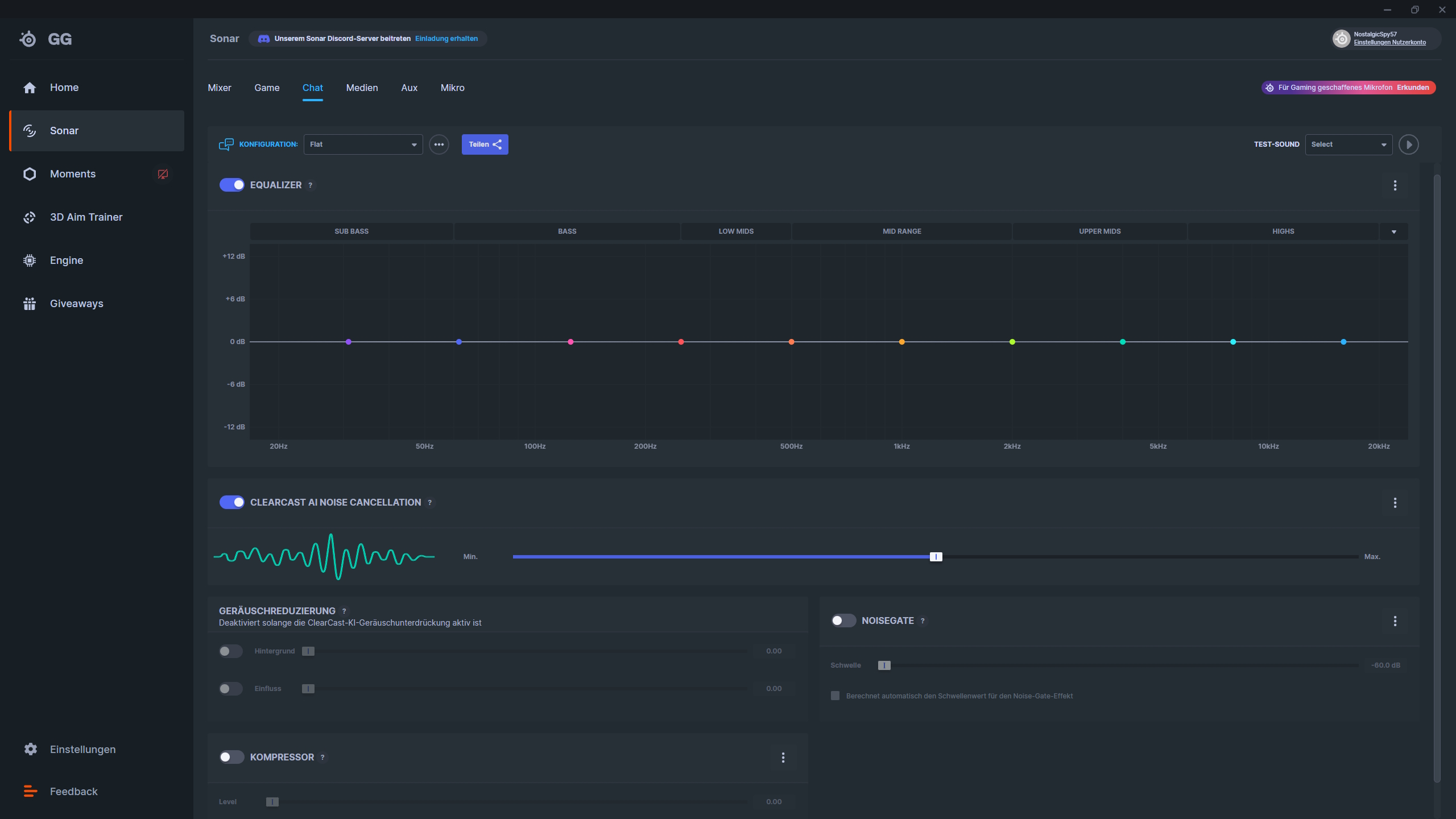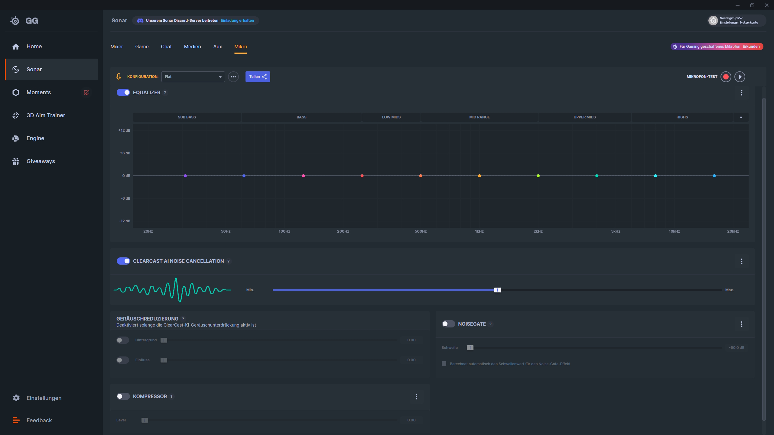 Dies ist eine Testaufnahme mit dem SteelSeries Arctis Nova 5 Wireless. An den Einstellungen der Software haben wir für diese Aufnahme nichts geändert. Stadardmäßig ist Clearcast AI Noise Cancellation aktiviert. Dabei soll alles außer unserer Stimme ausgeblendet werden, was diese Funktion auch tatsächlich schafft. Allerdings kommt das Gefühl auf, dass einige unerwünschte Töne verstärkt werden – hier muss man vor allem auf die etwas überbetonten „S“ Laute hören.