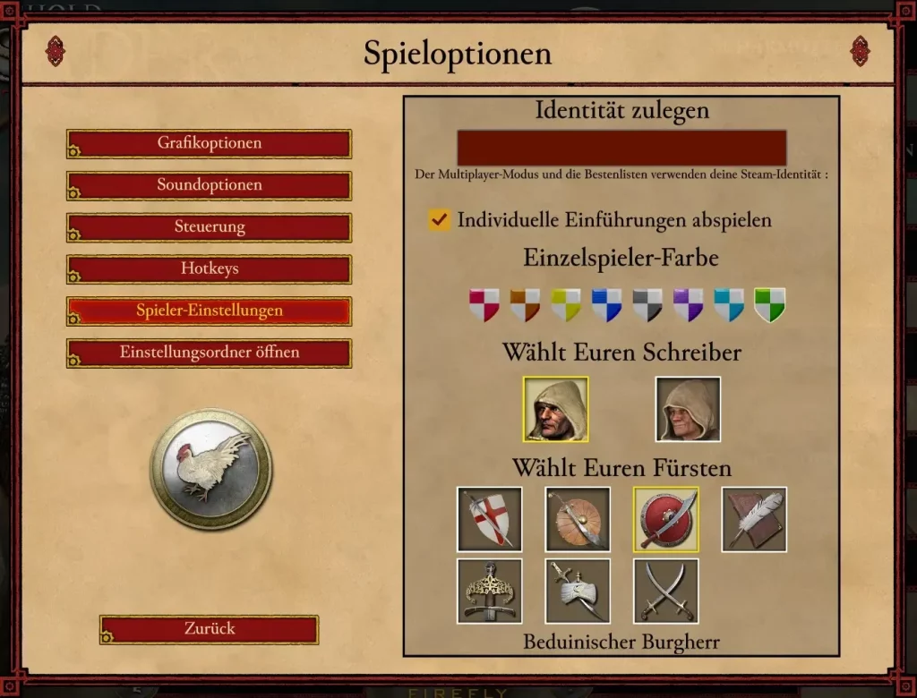 Sehr angenehm ist auch die modernisierte Steuerung, bei der man ganz einfach zwischen klassischer und moderner Steuerung wählen kann – je nachdem, was einem besser liegt. Auch das UI wirkt deutlich aufgeräumter: Bessere Icons, eine klarere Struktur und viele kleine Komfortfunktionen machen die Bedienung spürbar angenehmer. Besonders gut gefallen mir die erweiterten Personalisierungsoptionen. So kann man nun die Farbe seines Lords frei wählen, sich zwischen drei spielbaren Fürsten (Kreuzritter, arabisch oder beduinisch) entscheiden und sogar als männlicher oder weiblicher Charakter antreten. Als kleines Gimmick gibt es außerdem einen zusätzlichen Burgherrn zum Freischalten: den Schreiberling.