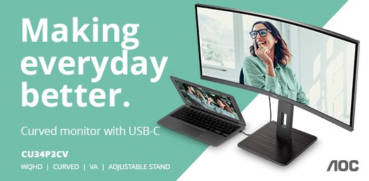Der 34“ (86,36 cm) UW-QHD-Monitor AOC CU34P3CV bietet ein noch immersiveres Seherlebnis und verfügt über ein VA-Panel mit einem Seitenverhältnis von 21:9 und einer 1500R-Krümmung. Dank seiner großzügigen Bildschirmfläche ersetzt er praktisch ein Dual-Monitor-Setup. Mit seinem USB-C-Eingang (65 W Power Delivery), dem 4-Port-USB-3.2-Hub sowie dem RJ-45-Eingang verfügt er über vielfältige Konnektivitätsoptionen. Der Monitor bietet außerdem eine Bildwiederholrate von 100 Hz und Adaptive-Sync, weshalb er sich auch fürs Gaming eignet. Zwei 5-W-Lautsprecher, ein höhenverstellbarer ergonomischer Standfuß und ein KVM-Switch für nahtloses Umschalten zwischen verschiedenen Geräten runden das Gesamtpaket ab.
