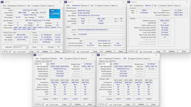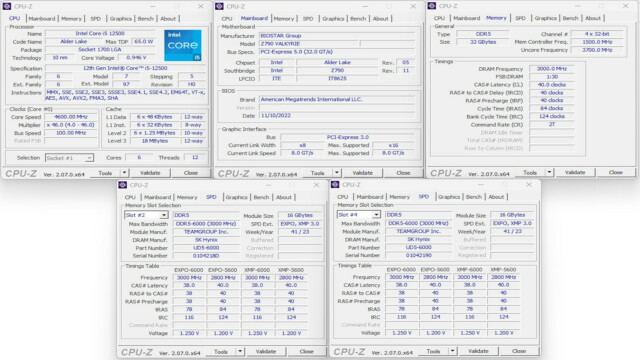 Da das VULCAN ECO Speicher-Kit mit 5600 MT und 6000 MT über zwei XMP-Profile verfügt, wiederholen wir unseren Test bei beiden Geschwindigkeiten, indem wir jeweils vorher das entsprechende XMP-Profil im BIOS laden. Auch hier überprüfen wir mit CPU-Z ob die Profile auch korrekt geladen wurden und messen danach mit dem Cache & Memory Benchmark von AIDA64 den Durchsatz. So erreichen wir bei 5600 MT mit 72729 MB/s lesend, 76899 MB/s beim Schreiben und 68776 MB/s beim Kopieren einen deutlichen höheren Durchsatz. Die Latenz liegt hier 77,1 ns. Mit dem zweiten Profil 6000 MT legen wir mit 78146 MB/s, 81024 MB/s und 74517 MB/s beim Lesen, Schreiben und Kopieren noch mal an Durchsatz zu. Die Latenz sinkt hier mit 73 ns auch.